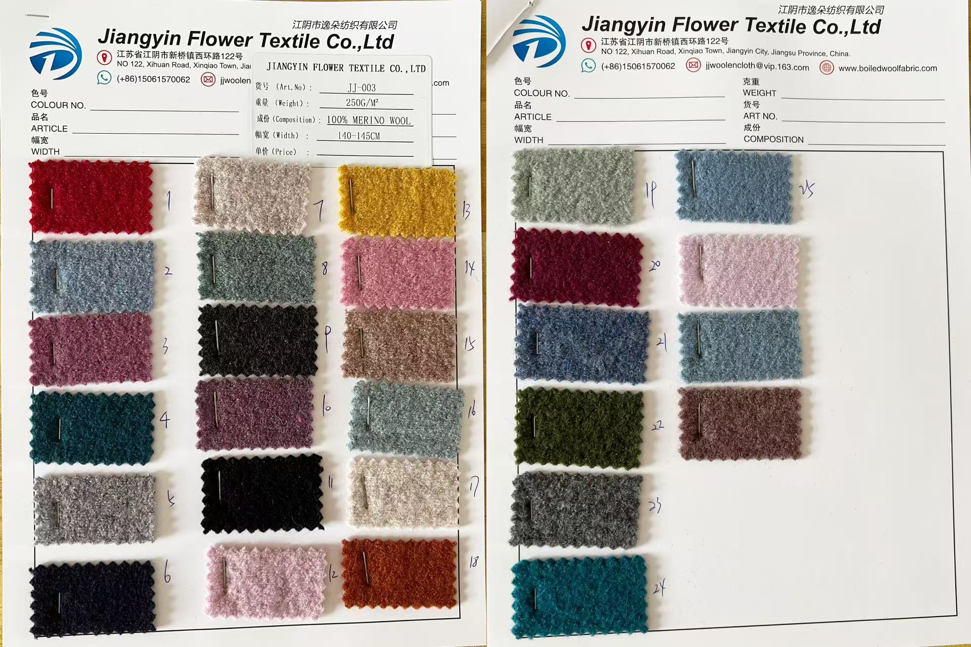Article NO:JJ-003 Composition:100%merino wool Weight:260g/sqm Width:140-145cm. MOQ:1000M/COL We stock wool material for this article with a large quantity because we produce bulk orders of 100% boiled merino wool fabrics more than 100,000 Meters for our regular clients every year,so we have the most competitive price for this article.Our regular clients are most of renowned wholesalers in Europe.America and Oceania.Like Netherlands,Germany,Austria,France,UK,Italy,Canada,Australia,New Zealand and so on. We're the supplier and partner of them for a long term.Our clients export our 100% boiled merino wool fabrics to much more countries through their agents,maybe you are just one of our clients. The softness and hygroscopicity of Merino wool make it highly suitable for making underwear. It can gently cling to the skin, providing a comfortable wearing experience. Meanwhile, it can keep the body warm in cold weather and keep it dry in warm weather. It is an ideal material for making…