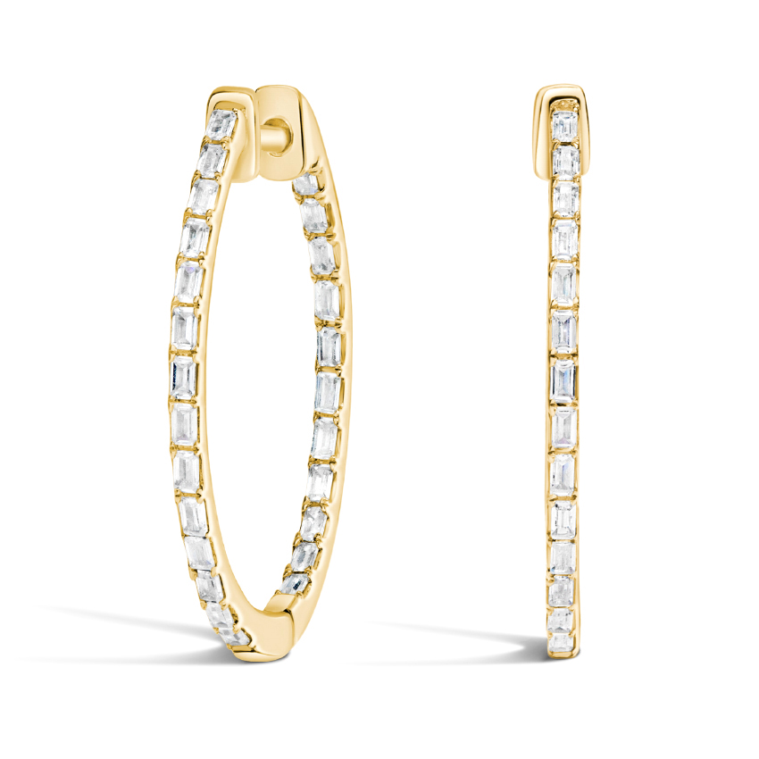 2.4ct Total 18K Yellow gold D VS1 Lab Diamond Inside Out Hoops Lab Diamond Earrings: Emerald Cut Hoop Earrings with 2.4 Carat Diamonds, Vintage Earrings for Timeless Elegance The Lab Diamond Earrings collection offers a stunning blend of modern innovation and classic charm, perfect for those who appreciate the beauty of emerald cut hoop earrings with a 2.4 carat diamond presence. These vintage earrings are crafted with precision and elegance, making them an ideal choice for any occasion that demands sophistication and refinement. Key Features of Lab Diamond Earrings: These emerald cut hoop earrings feature a unique design that highlights the brilliance of lab-grown diamonds, offering the same visual appeal as natural stones without the environmental impact. Each pair is set in high-quality metal, ensuring durability and a luxurious finish. The 2.4 carat diamond earrings provide a striking focal point, while the vintage style adds a touch of old-world glamour. Whether worn daily or r…