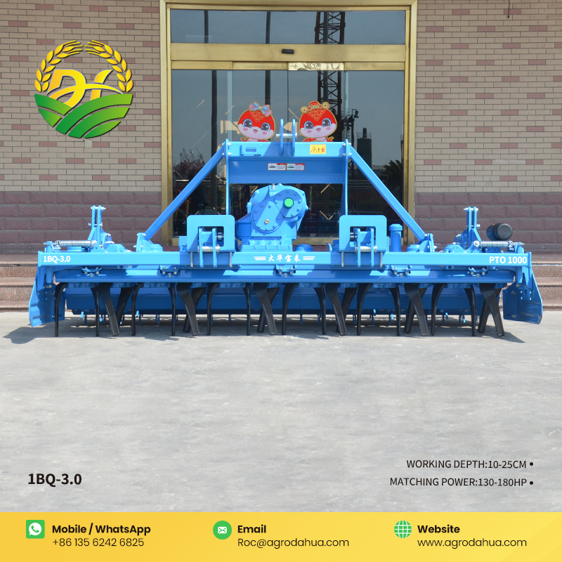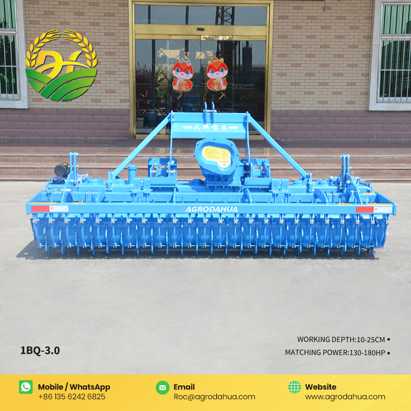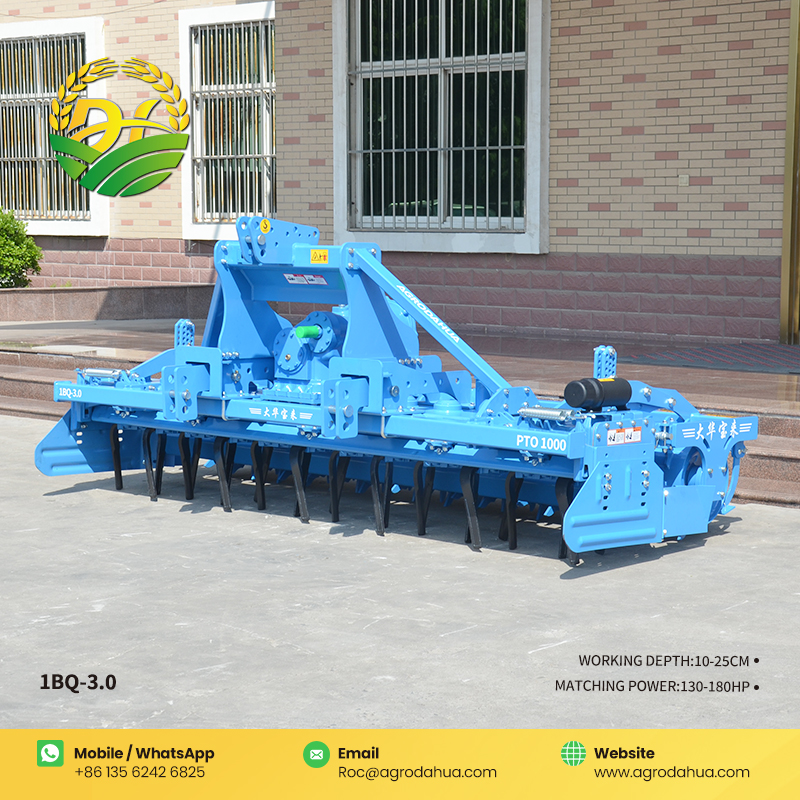 AGRODAHUA Power Harrow comes in three models: standard, heavy-duty, and folding, which can adapt to different operating conditions and meet the needs of a wider range of horsepower. It can also be equipped with a quick hitch device to work in conjunction with a variety of precision seeding machine products, reducing tillage time and costs to improve production efficiency. The operation process does not disturb the original plow layer, crushes the topsoil finely, and levels to retain moisture, creating favorable conditions for precision seeding and other mechanized planting operations. 1BQ-3.0 Power Harrow, working width 300 cm, matched with 130-180 HP tractors, fully equipped with 12 sets (24 tines), working depth up to 10-25 cm.