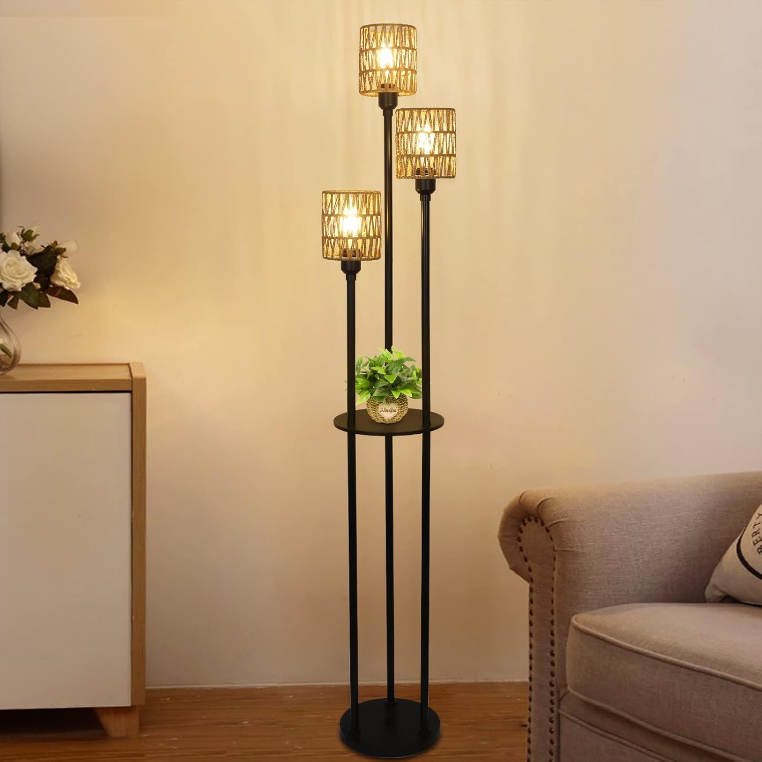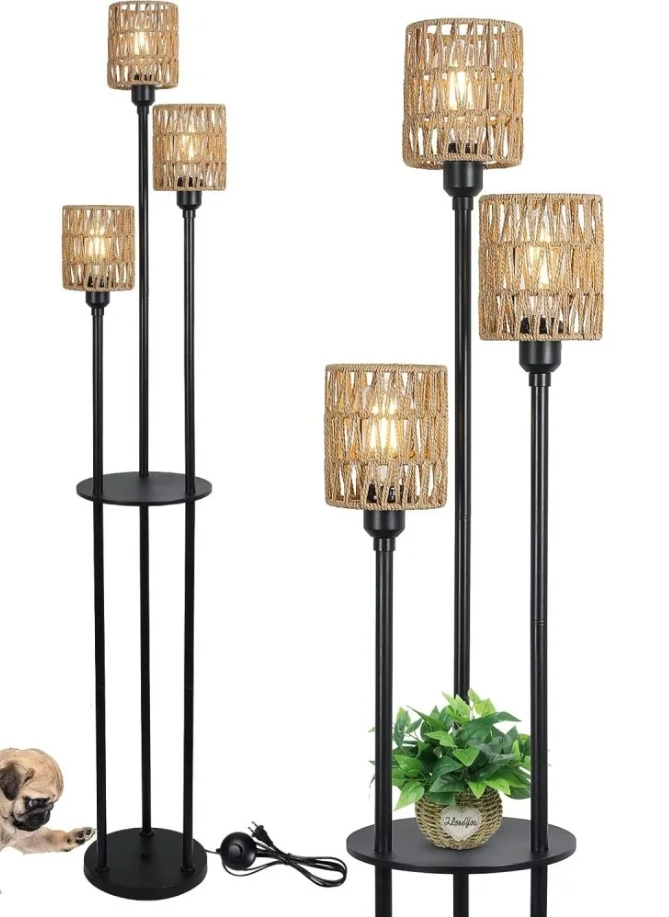 About this item ✤【3-Lamp Hanging Floor Lamp】This floor lamp is made up of three handmade natural rope shades and a metal stand. The combination of natural elements makes this country floor lamp perfect for Bohemian, country, vintage, and industrial home decor.It is a home lighting and LED lighting. The three lamp rods are secured to a heavy metal base, making this freestanding lamp stable. The weighted base design of the platform floor lamp is intended to prevent tip overs, keeping you and your family safe at home. 【Floor lamp with shelf】This living room floor lamp features a 10.2-inch shelf made of high-density fiber material (max load 50 pounds), perfect for holding and displaying objects. You can place plants, picture frames, books, or any small items you desire. No matter where you install this country floor lamp, whether it's in the living room, bedroom, dining room, study, office, bedside, or corner sofa, it will bring just the right amount of light and a wonderful home a…