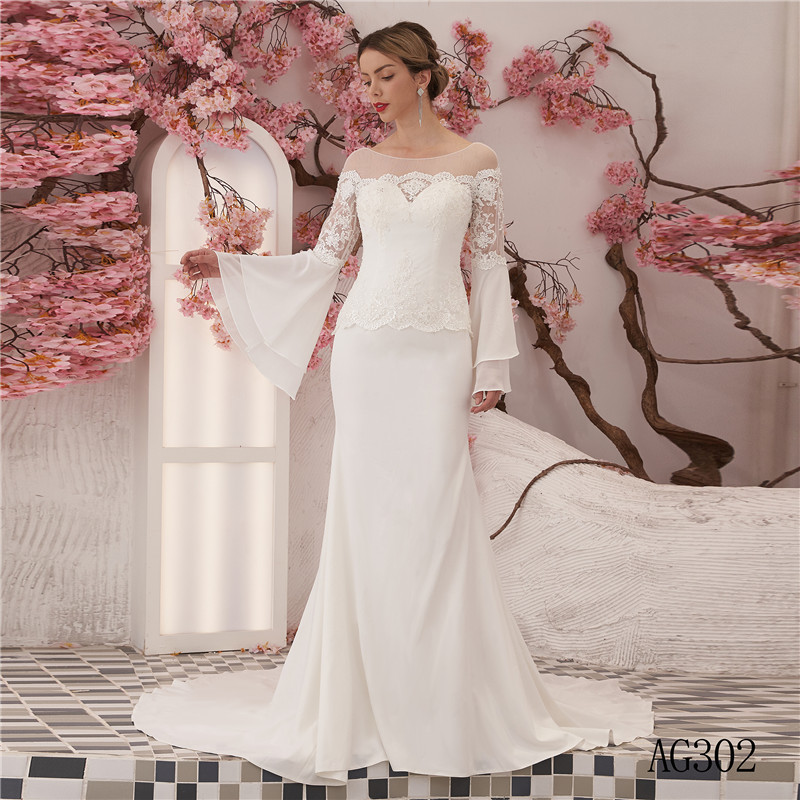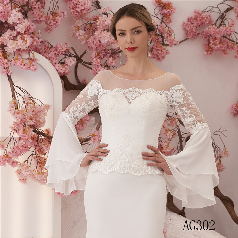 Elegant A-line Floor-length Bridal Gown white Organza bell sleeve lace wedding dress
