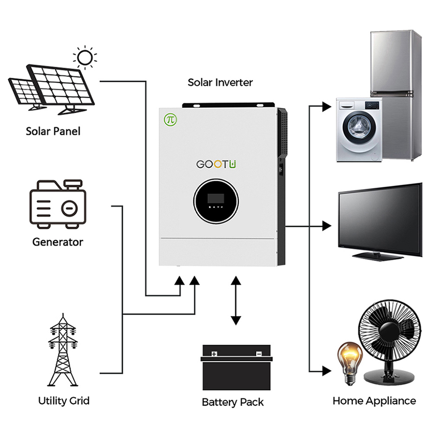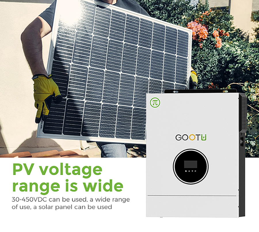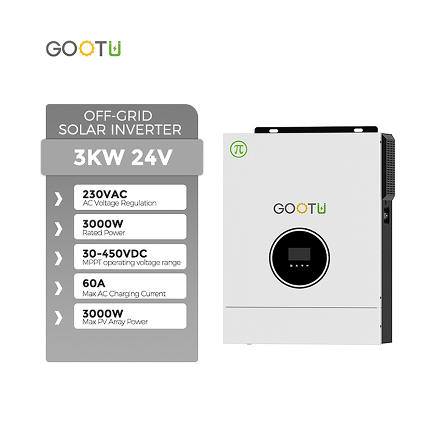 GOOTU 3000W 24V Off Grid Solar Inverter 24V Low Voltage Series (Max.Voc:145V;Rated input voltage:220/230V) Performance characteristics:·Load friendly: Stable sine wave AC output via SPWM modulation·Supports a wide range of battery technology: GEL, AGM, Flooded, LFP, and program.·Dual LFP battery activation method: PV&mains·Uninterrupted power supply: simultaneous connection to utility grid/generator and PV ·Intelligent programming: the priority of the output from different energy sources can be set ·High energy efficiency: up to 99.9% MPPT capture efficiency·Instant viewing of operation: the LCD panel displays data and settings ,while you can also be viewed using the app and webpage·Power saving: power saving mode automatically reduces power consumption at zero-load·Efficient heat dissipation: via intelligent adjustable speed fans·Multiple safety protection functions: short circuit protection, overload protection, reverse polarity protection, and so on. under-voltage and over-…