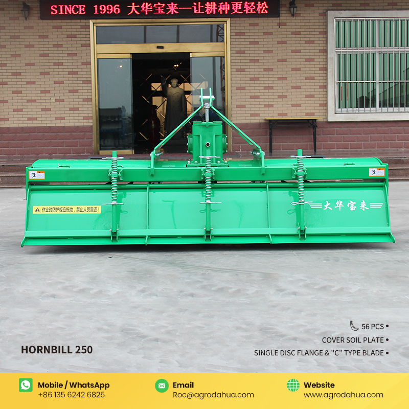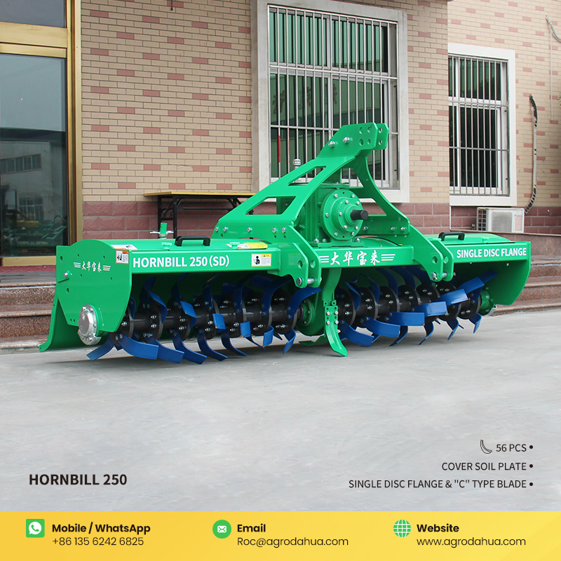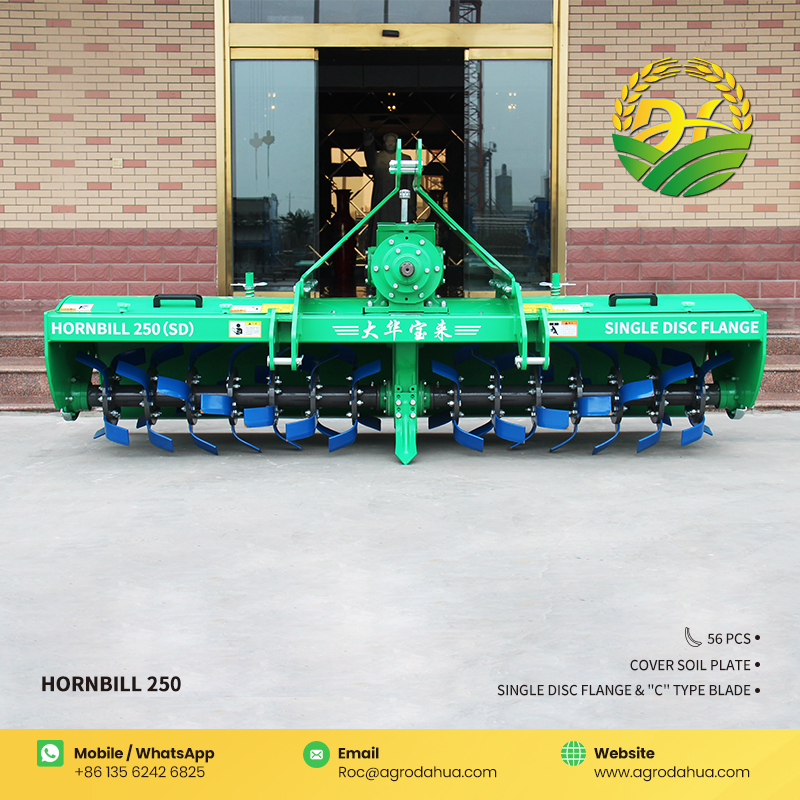 The HORNBILL 250 Rotary Tiller is compatible with tractors of 120–150 horsepower. It features a working width of 250 cm and an overall weight of 710 kg. Fitted with single-disc C-type cutters, its cutterhead is precision-forged from Grade 45 steel, which reliably ensures consistent working depth. The tiller comes fully equipped with 56 rotary blades, and the cutterhead and blades are installed using an embedded mounting process. Combined with customized blades, the dedicated cutterhead delivers exceptional adaptability, effortlessly handling even harsher operating conditions, with a tillage depth ranging from 8 cm to 25 cm.