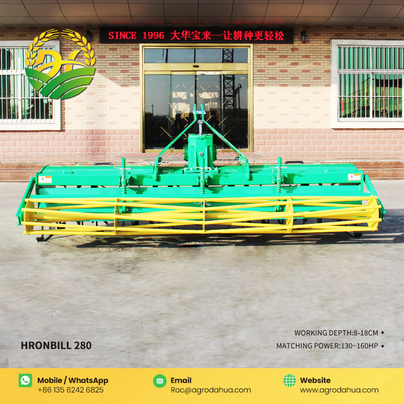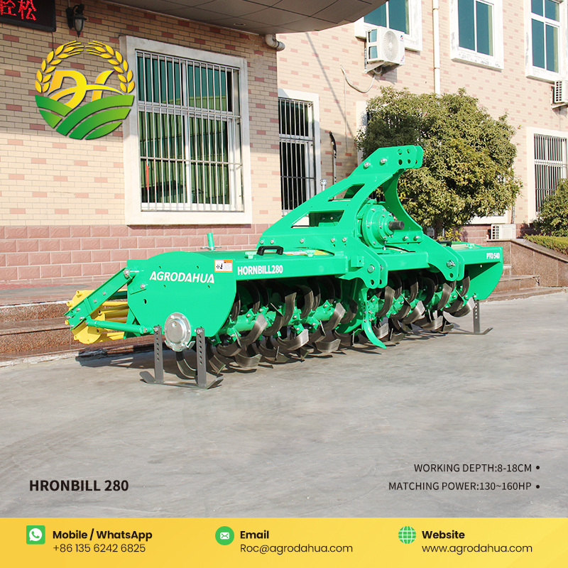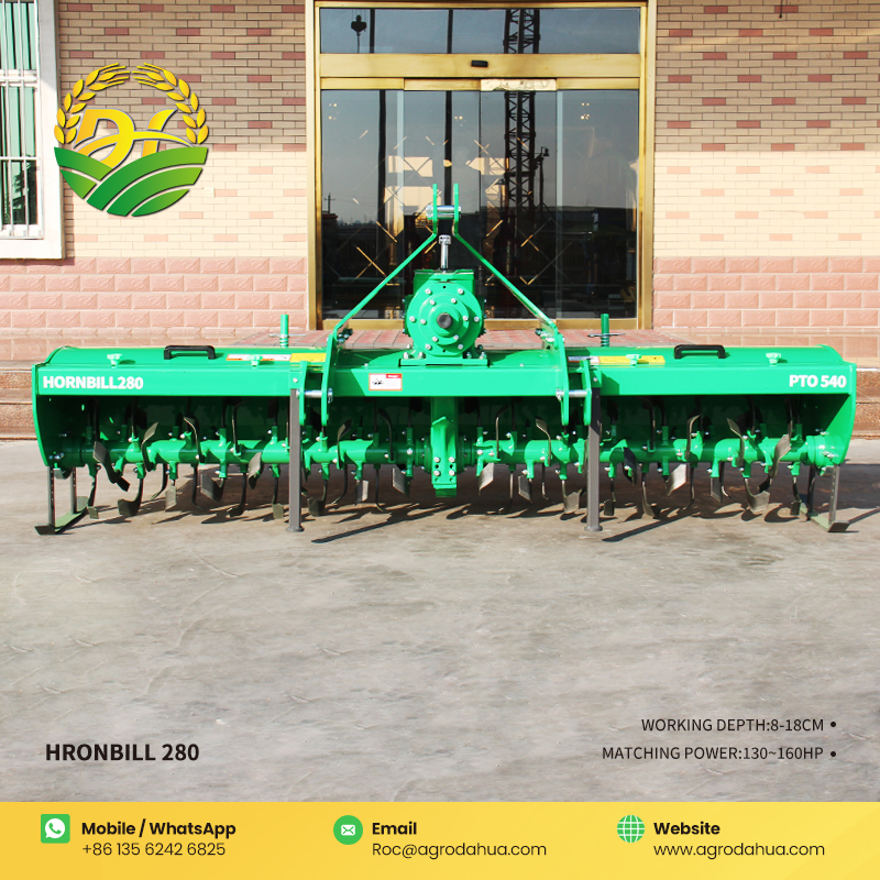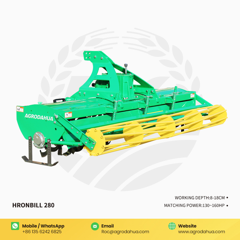 The Hornbill 280 Rotary Tiller features strong soil crushing capability and leaves a flat surface after tillage. It can be matched with tractors of 130-160 horsepower and is equipped with 80 wear-resistant rotary tiller blades. Adopting advanced diamond wear-resistant coating technology, it significantly enhances the blades' wear resistance and service life while reducing replacement frequency. The 10-module large gearbox ensures stable power transmission. A high-strength wear-resistant protective plate is installed at the bottom of the gearbox, which resists abrasion and extends the gearbox's service life. The integrated suspension frame design improves the overall structural strength and stability.