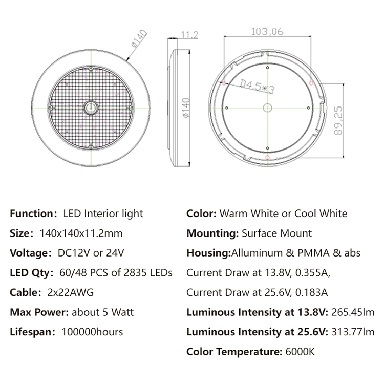 Ultra bright dome light 12V/24V aluminum housing truck interior light Precise Color Temperature: The 4500-6500K LED light is brighter yet retains a warm ambiance, avoiding an overly harsh glare. Designed for RVs, reducing visual fatigue, making every long journey feel like home Effortless Stepless Dimming: Smoothly adjust the brightness of RV interior lights from 10% to 100% to suit your needs, whether you're reading, chatting, or relaxing. Find the perfect light intensity for any occasion Intelligent Memory Function: With a built-in smart memory chip, the LED ceiling light remembers your last brightness setting, eliminates repetitive adjustments, ensuring seamless personal lighting Compact 12/24 V DC Design: Specially crafted for low-voltage environments like RVs and Camepers, its compact 5.51 inch size seamlessly integrates into your vehicle's interior, providing reliable and stylish lighting Advanced Cooling System: High-quality aluminum baseplate…
