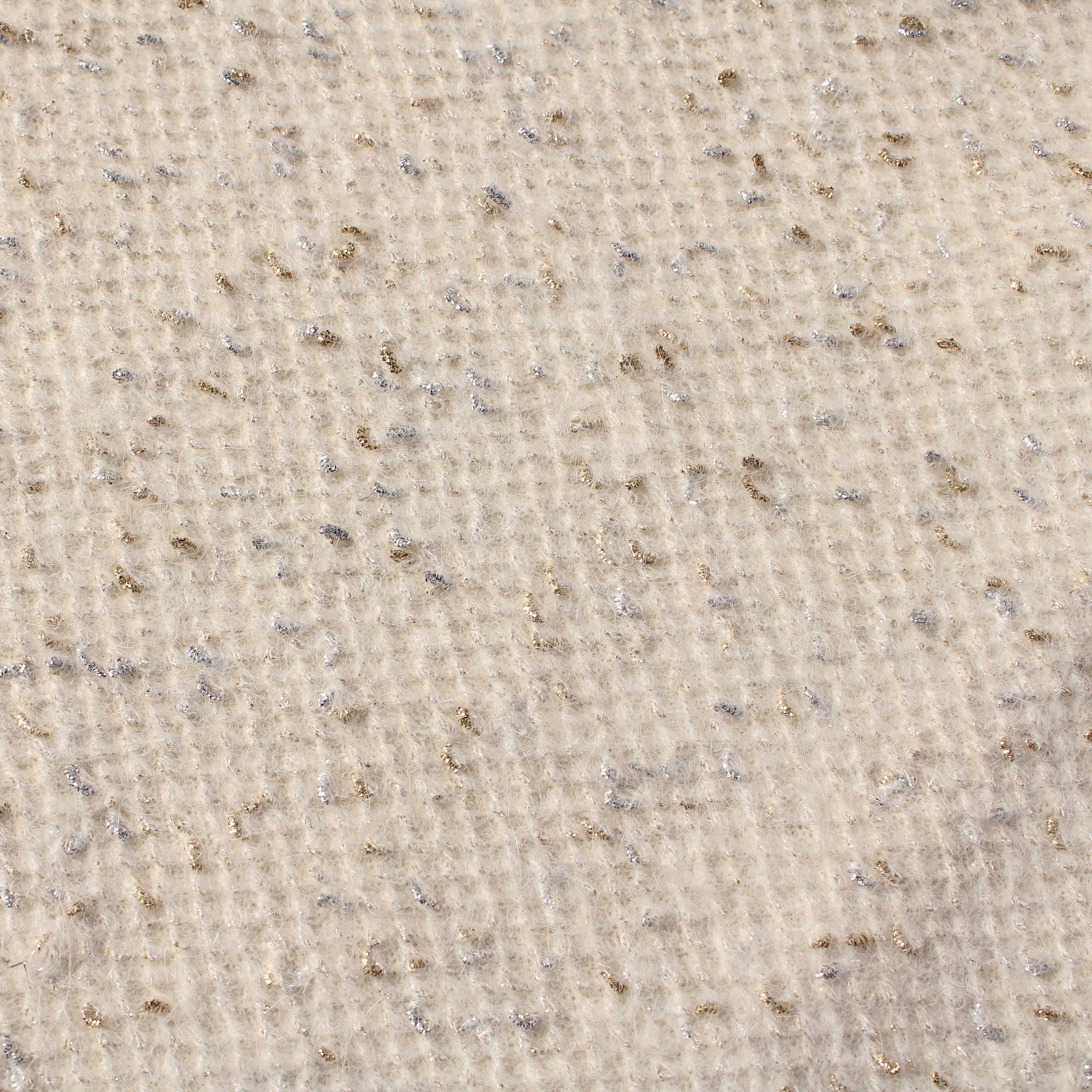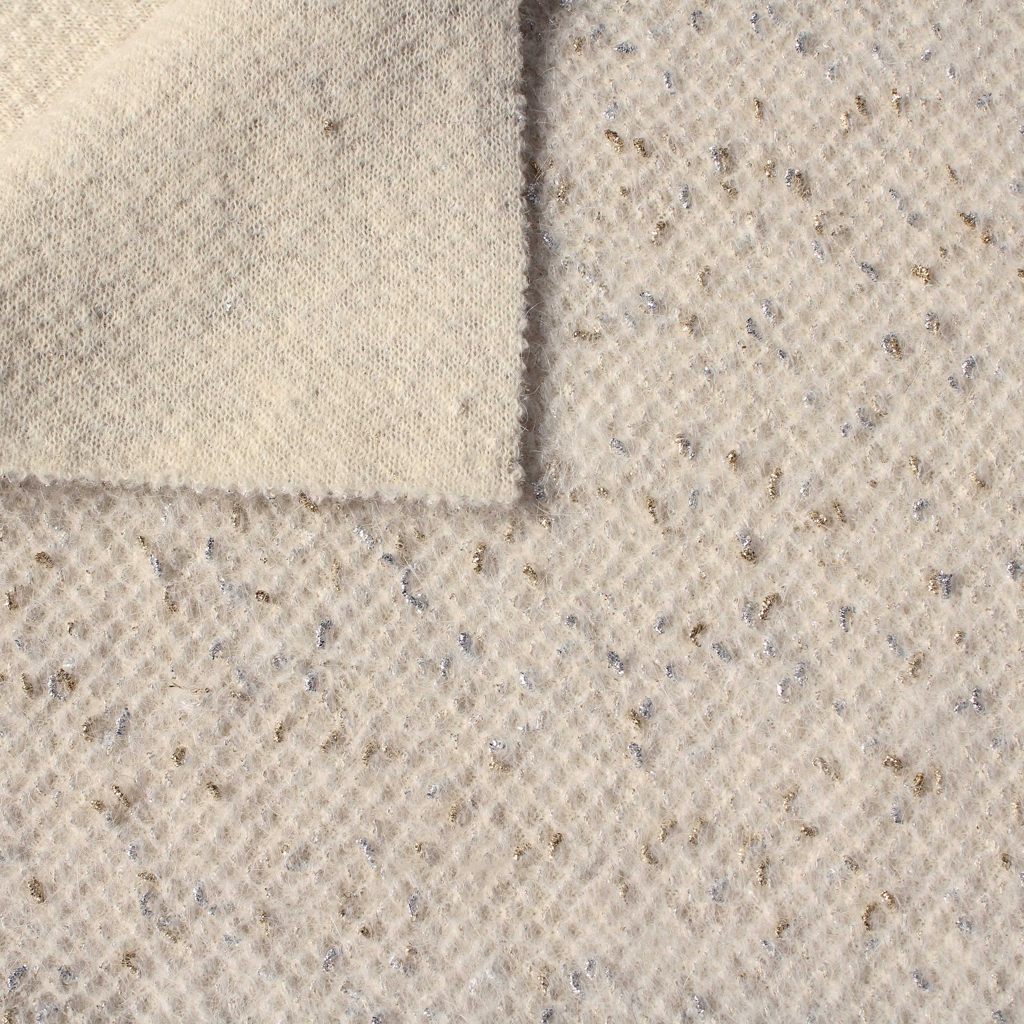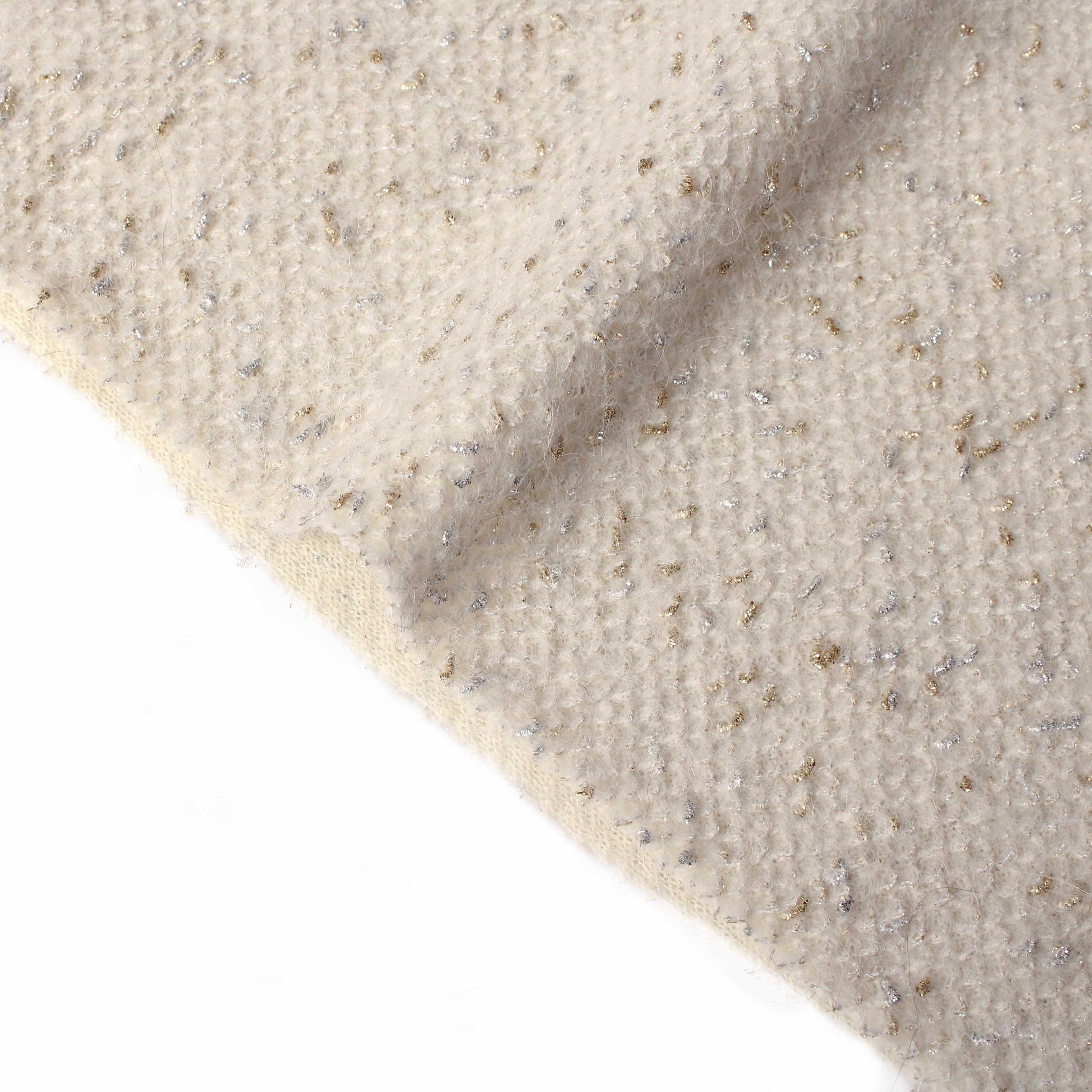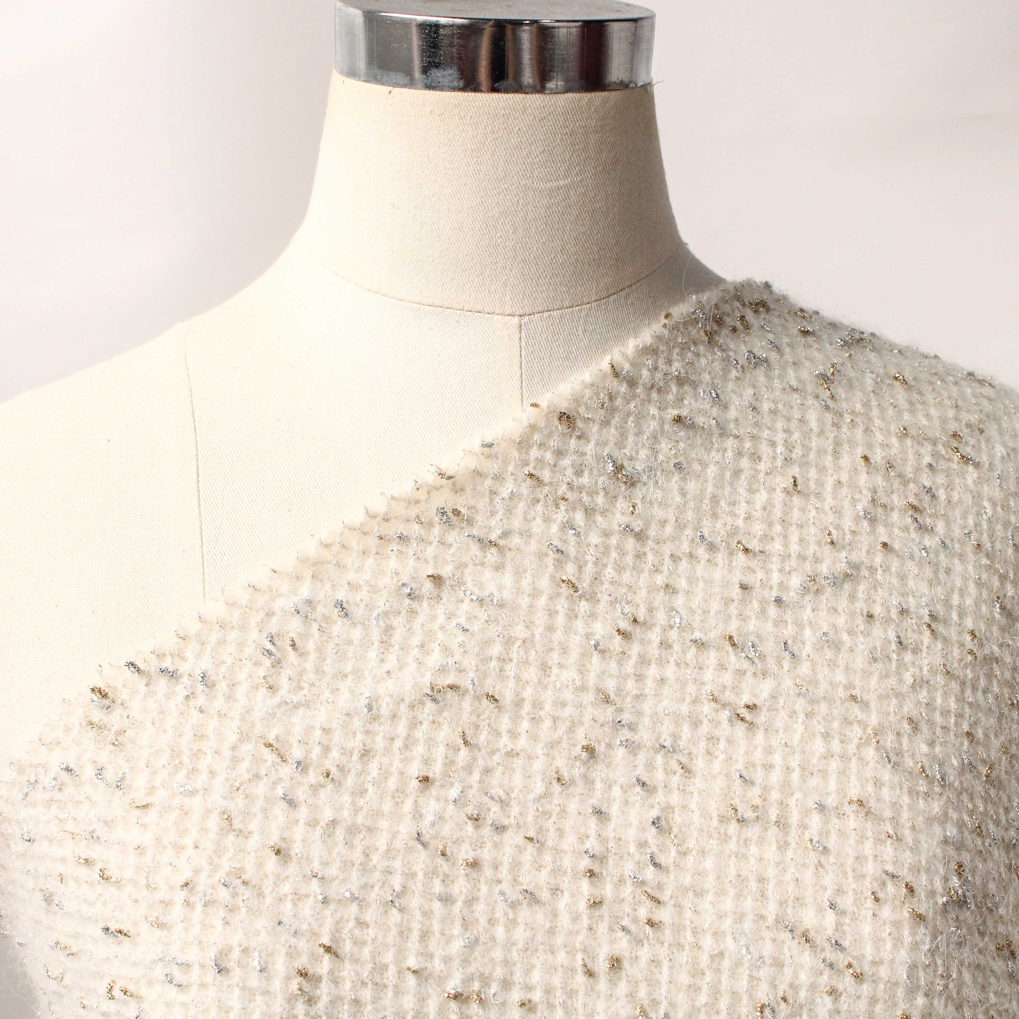 White Wool mohair blended fabric with Metallic Shimmer Exquisitely crafted from the blend of wool, mohair, and alpaca, this fabric embodies a trifecta of unparalleled softness, superior warmth, and timeless elegance. Its pristine white base is elevated by a delicate scale-like texture, which imparts subtle dimensional depth and understated sophistication to every yard. What truly sets this fabric apart is the integration of soft gold and silver metallic knot yarns—unlike the rigid metallic threads of conventional fabrics, these yarns are uniquely pliable and gentle against the skin. With the weight of 345g/m², it strikes the perfect balance between graceful drape and structural integrity. We are a specialized textile factory with full production control—from meticulous fiber sourcing to the final fabric. We have a very big fabric showing room for customers, including the woven fabric, knit fabric, boiled wool fabric, jersey fabric and so on... Don’t hesitate to get in touch…
