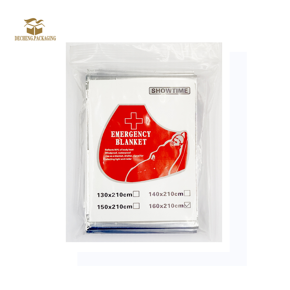 Decheng Silvery Thermal Blankets Quick Detail: 1. Different names of products: Thermal Blanket Survival Blankets For Camping Customized Thermal Blanket Emergency Blankets 2. Main uses: The main function of emergency insulation blanket is to maintain body temperature, prevent shock, and save precious time for saving lives and waiting for rescue. Description Place of Origin: Jiangyin, Jiangsu, China Brand Name: Decheng Model Number: TBS Certification: ISO 9001, SGS, REACH Minimum Order Quantity: 1000 pieces Price: / Packaging Details: pieces customizable Delivery Time: 7-15days Payment Terms: T/T, L/C Supply Ability: 500,000 pieces per month Company Description: Jiangyin Decheng Packaging Materials Co., Ltd., located in the economically vibrant Jiangyin City, Jiangsu Province, is a professional flexible packaging company specializing in R&D, slitting, and bag making. With multiple state-of-the-art flexible packaging production lines, we provide pr…