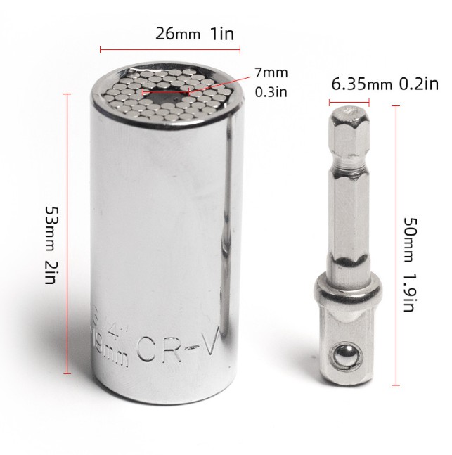 Universal Socket Wrench for Multi-Function Repair Tool Universal socket tool automatically adjusts to grip hex nuts, wing nuts, eye hooks, and square nuts of sizes ranging from ¼” to ¾ “, whether they’re new, rusty, or broken. Connect it via the adapter to a ratcheting screwdriver, a cordless screwdriver, or a drill for added convenience, versatility, torque, and speed. Universal Socket Features: Color Silver,matte,red,blue,black,green,yellow purple Size 5-14/7-19/9-21/9-27/11-32mm Type Universal socket Material Chrome Vanadium Steel Applicability Fits various specifications of screws Rotating head 360-degree rotatable ratchet design E.g., 72 teeth, small rotation angle Portability Compact, easy to carry and store One Socket for Most Nuts * The universal socket fits both standard 1/4 to 3/4 inch and metric 7 to 19 mm nuts and bolts. * Universal socket can also grasp any shape nut,such as wing nut,hook nut,flange nut,hex nuts, square nuts, crew ey…